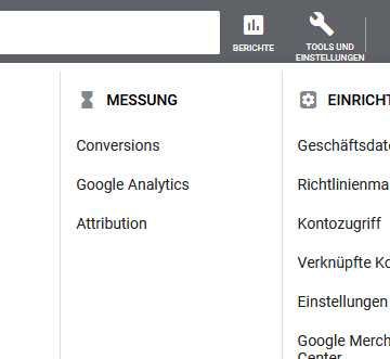 Öffne den Google Ads Manager und logge dich ein. Gehe im Kontextmenü auf „Tools und Einstellungen“ und gehe auf „Conversion“.