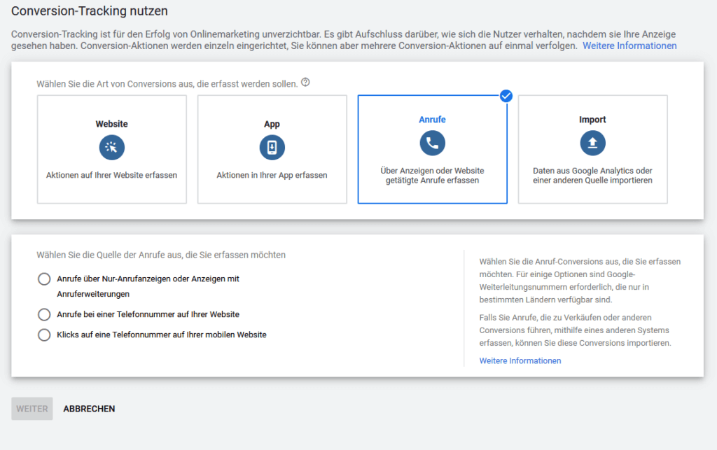 Die restlichen Einstellmöglichkeiten sind genauso durchzuführen, wie beim Tracking der „Nur-Anrufen-Anzeigen“.