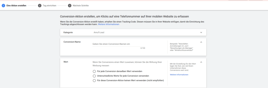 Achtung, hast Du die Option „Call-only“ gewählt, musst du eine Conversion vorgeben, damit der Anruf gewertet wird.