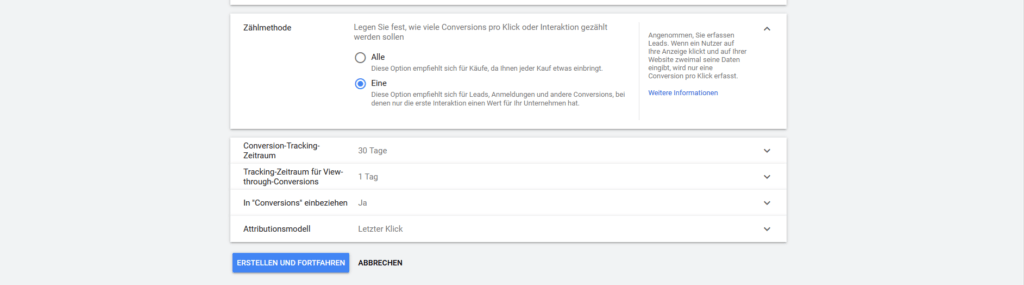 Tipp: Um ein Tracking mit einer möglichst hohen Aussagekraft zu erhalten, solltest Du unter Zählmethode am besten „Eine“ auswählen.