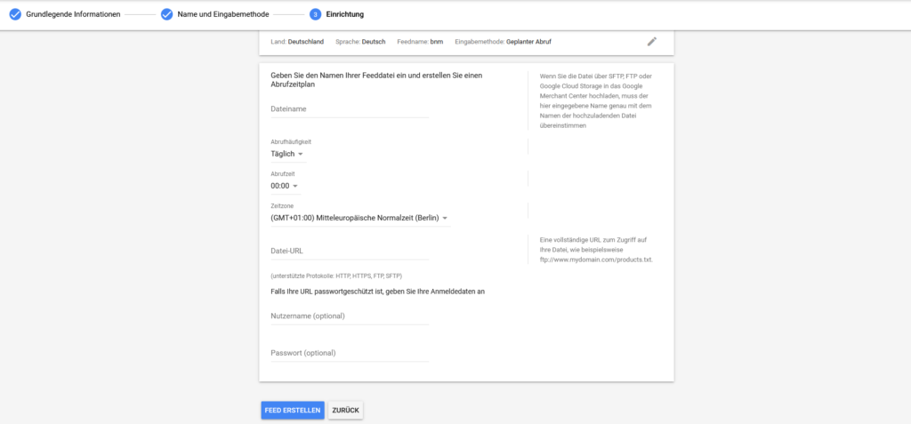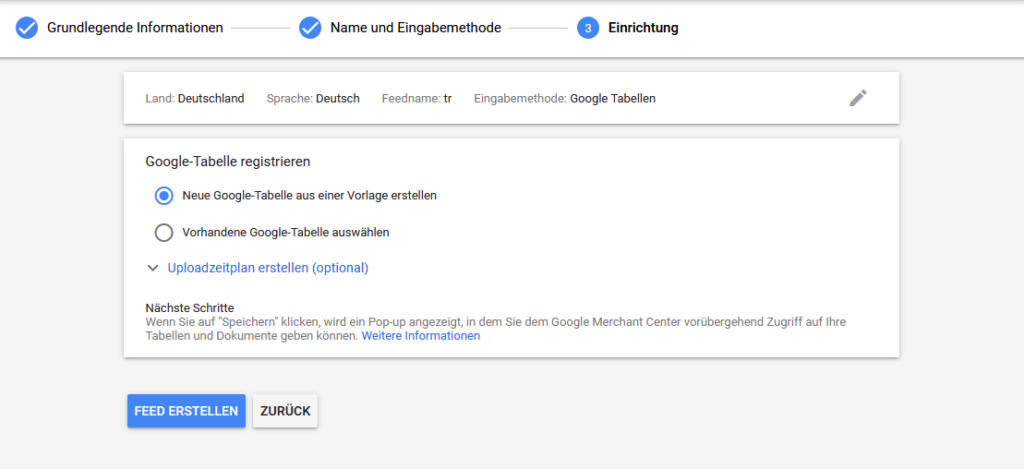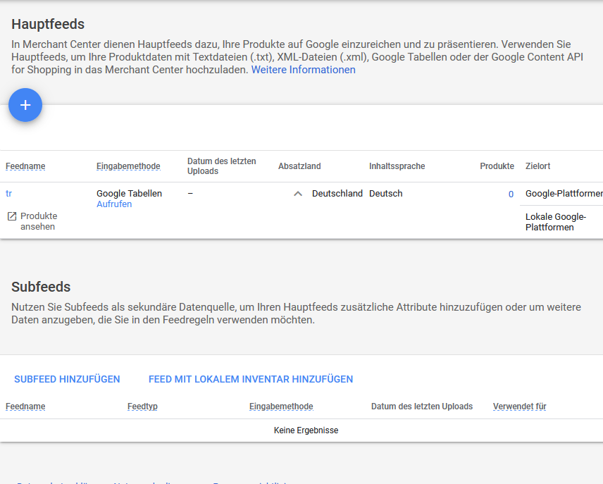 Wissenswert: Sobald du dein Merchant-Center mit der ersten Datenquelle verbindest, ändert sich die Ansicht. Du kannst gezielt einen Haupt- oder einen Sub-Feed erstellen.